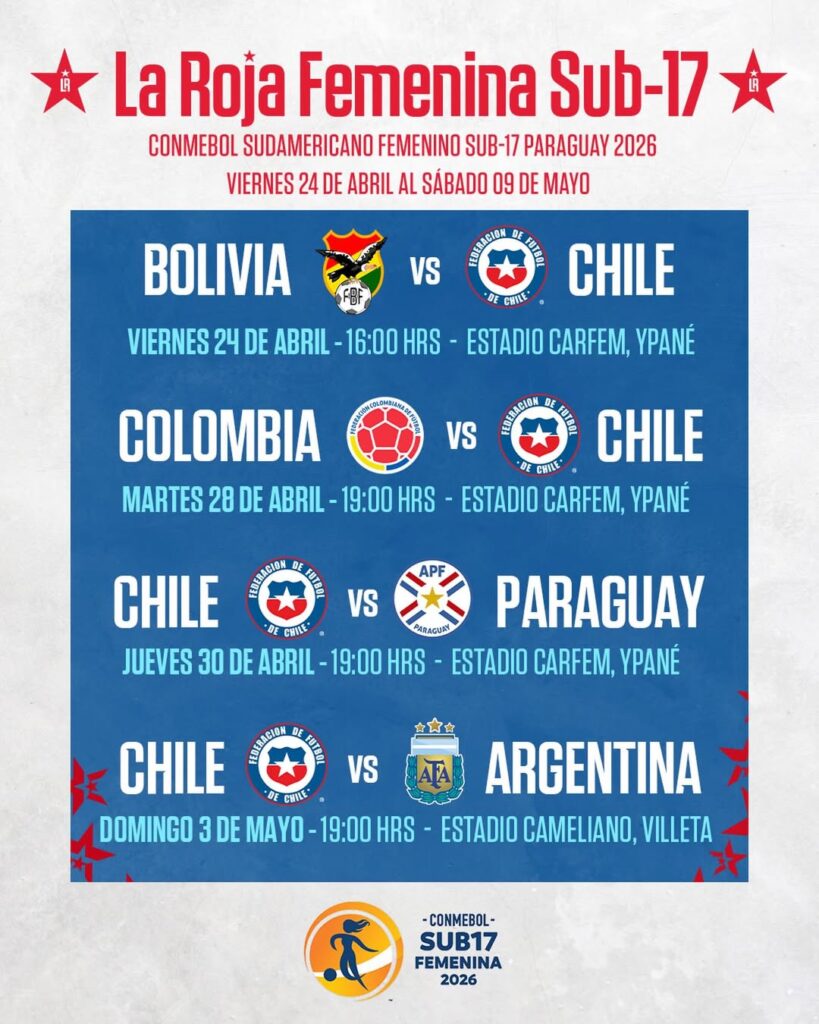 El combinado nacional, dirigido por Vanessa Arauz, formará parte del Grupo A junto a Paraguay, Colombia, Argentina y Bolivia. Precisamente, el debut de La Roja será este viernes ante Bolivia, a partir de las 16:00 horas, en el Estadio CARFEM.